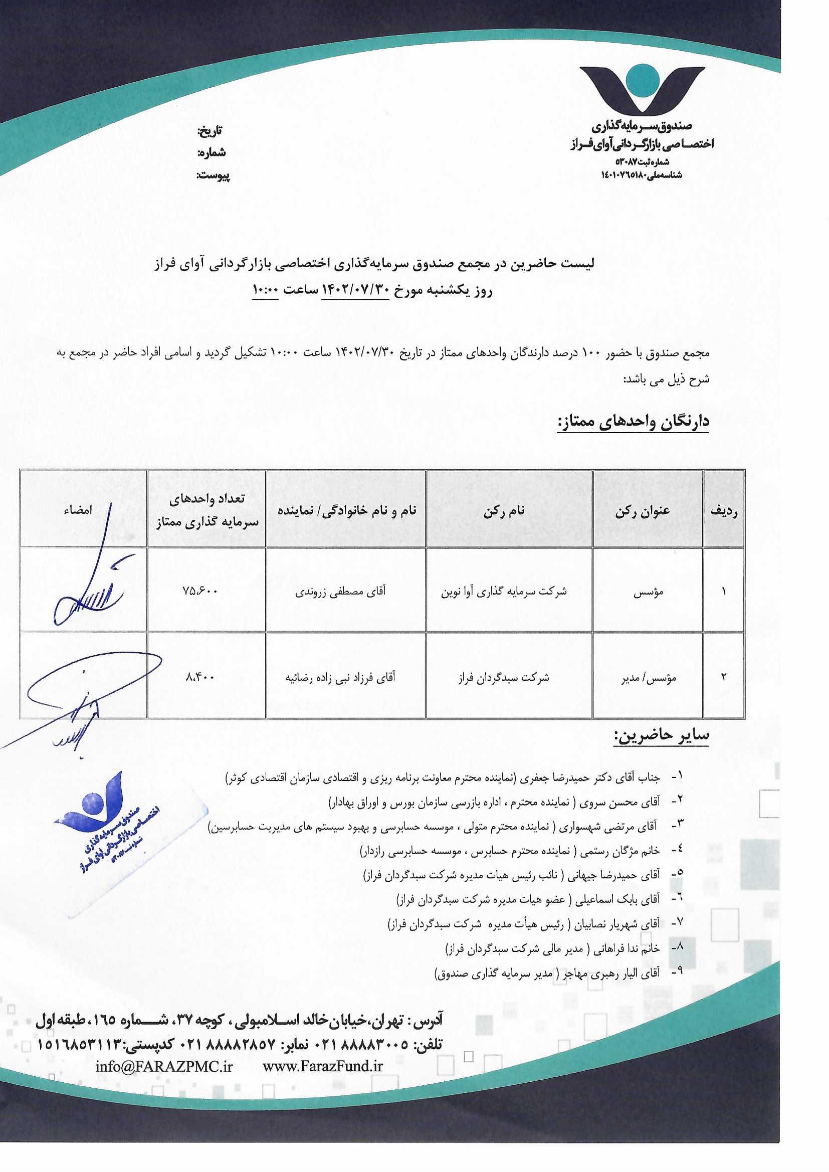 | عنوان خبر | لیست حاضرین در مجمع صندوق سرمایه گذاری اختصاصی بازارگردانی آوای فراز مورخ 1402/07/30 |