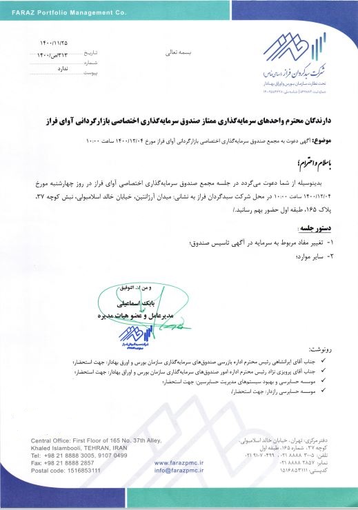 دعوتنامه مجمع صندوق سرمایهگذاری اختصاصی بازارگردانی آوای فراز مورخ ۱۴۰۰/۱۲/۰۴