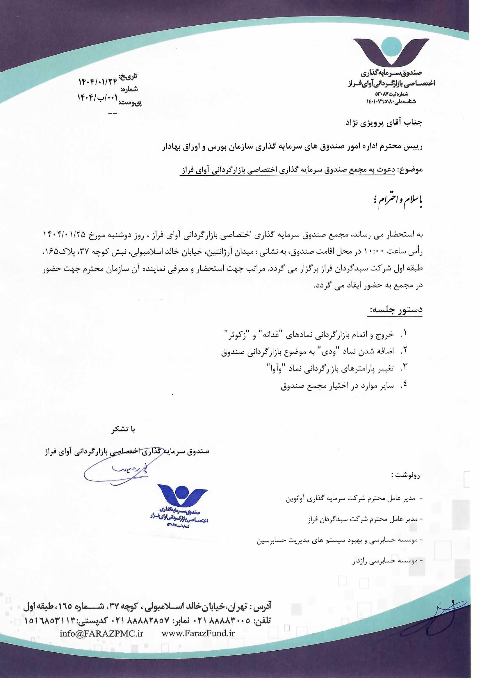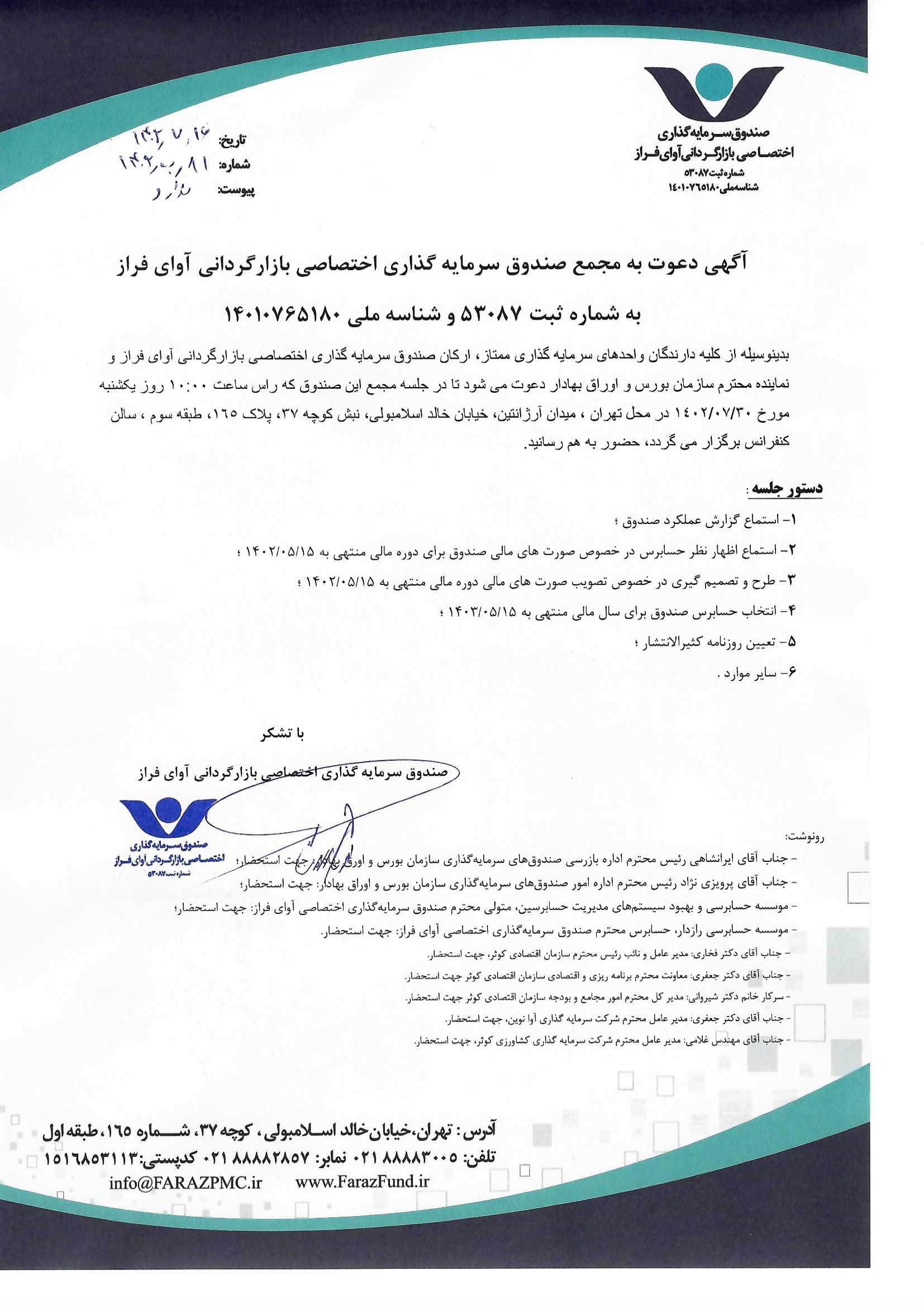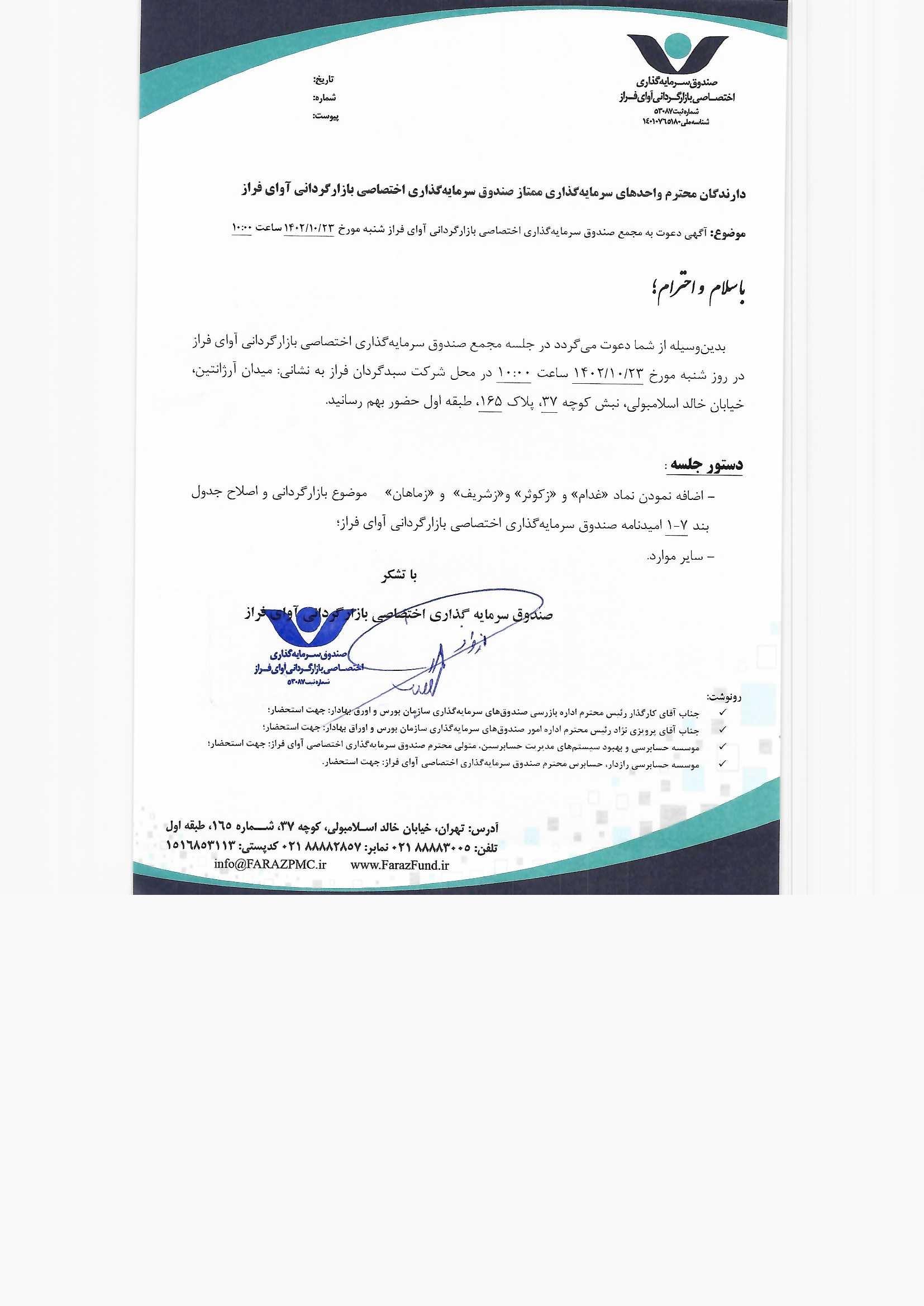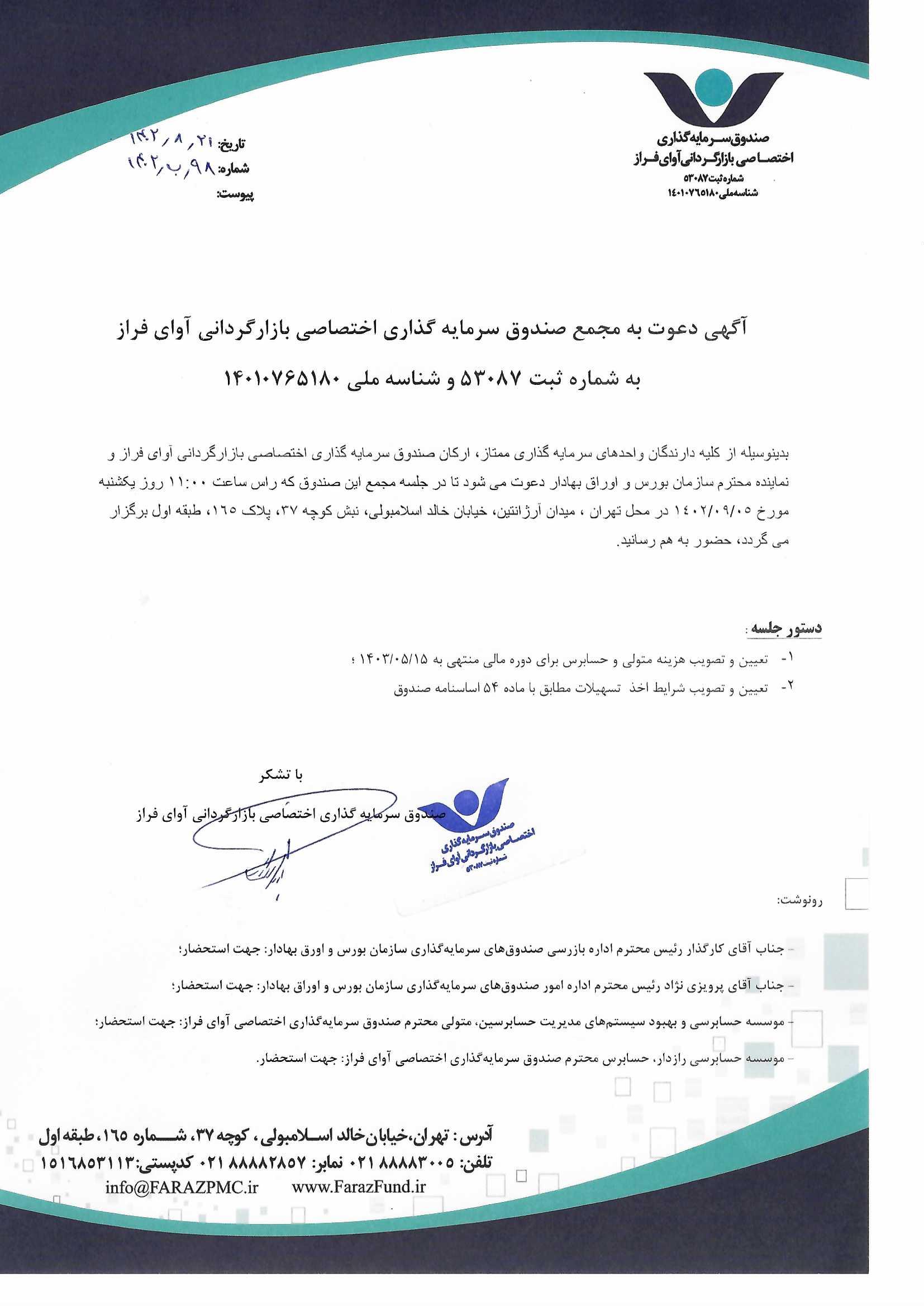 دعوت نامه به مجمع صندوق سرمایهگذاری اختصاصی بازارگردانی آوای فراز مورخ ۱۴۰۱/۰۶/۰۵ ساعت: ۱۰:۰۰