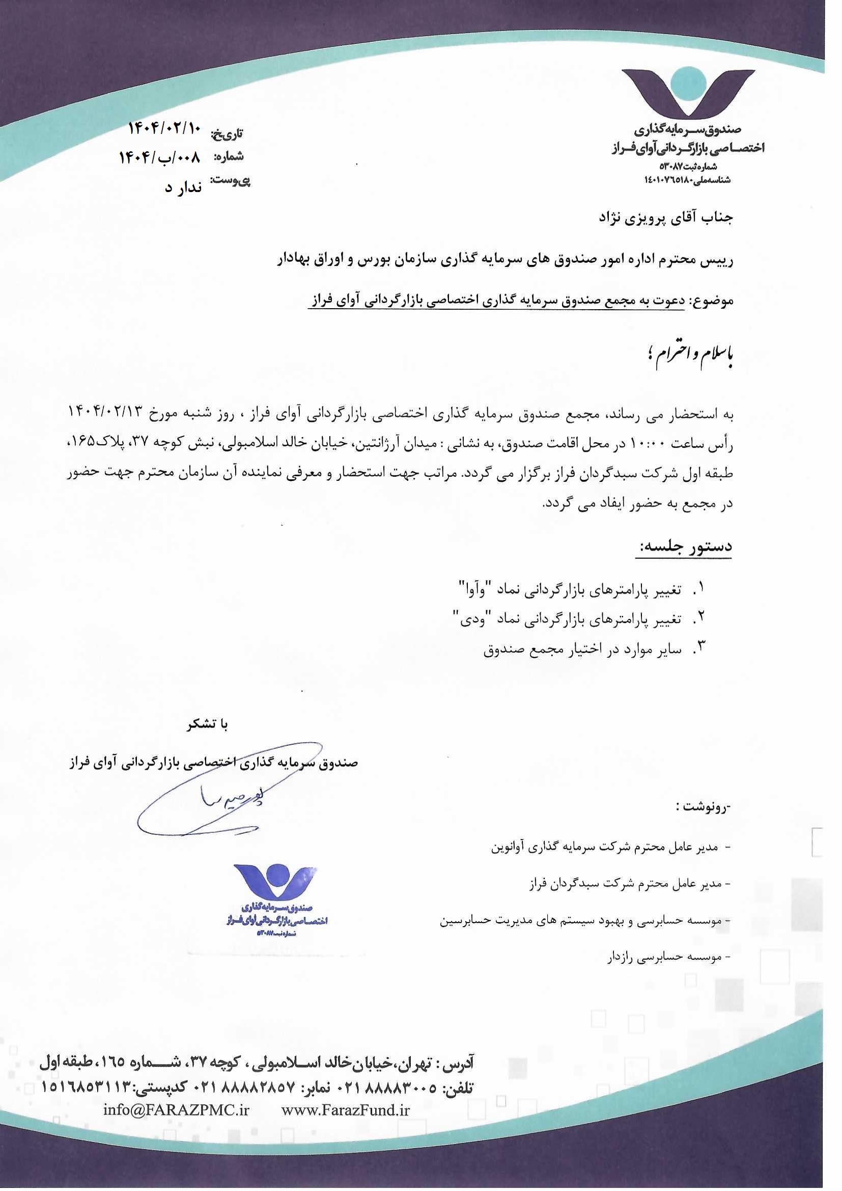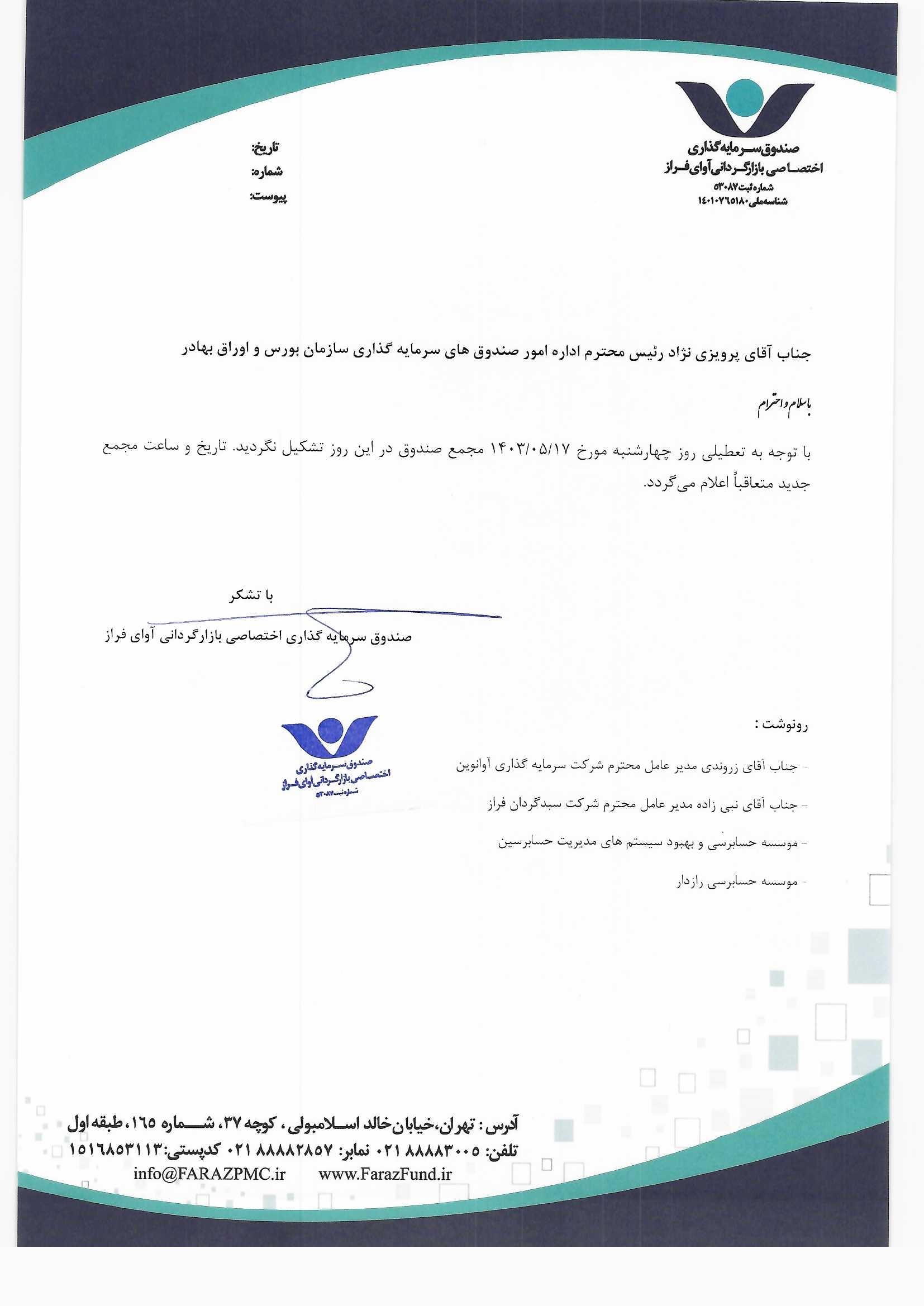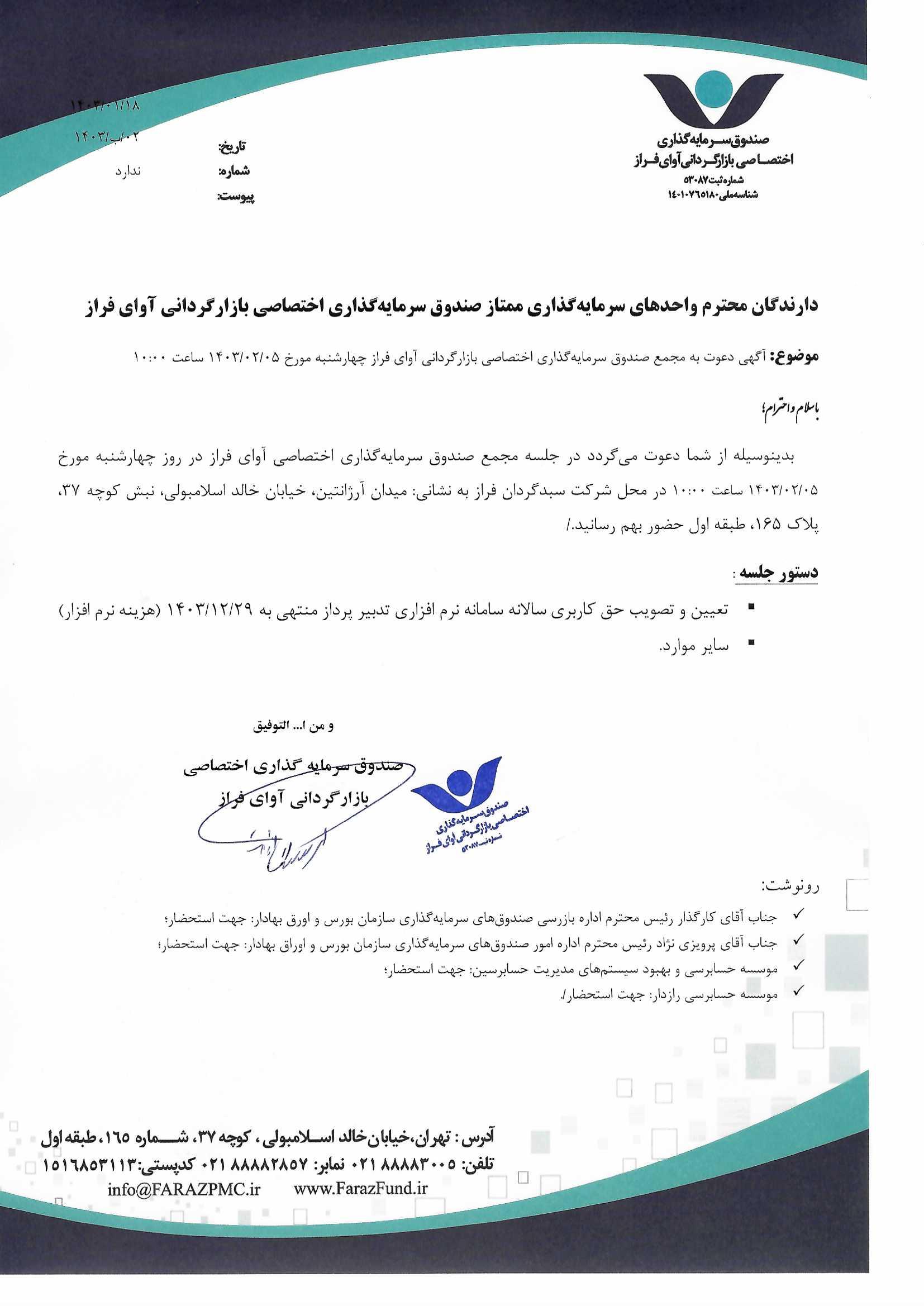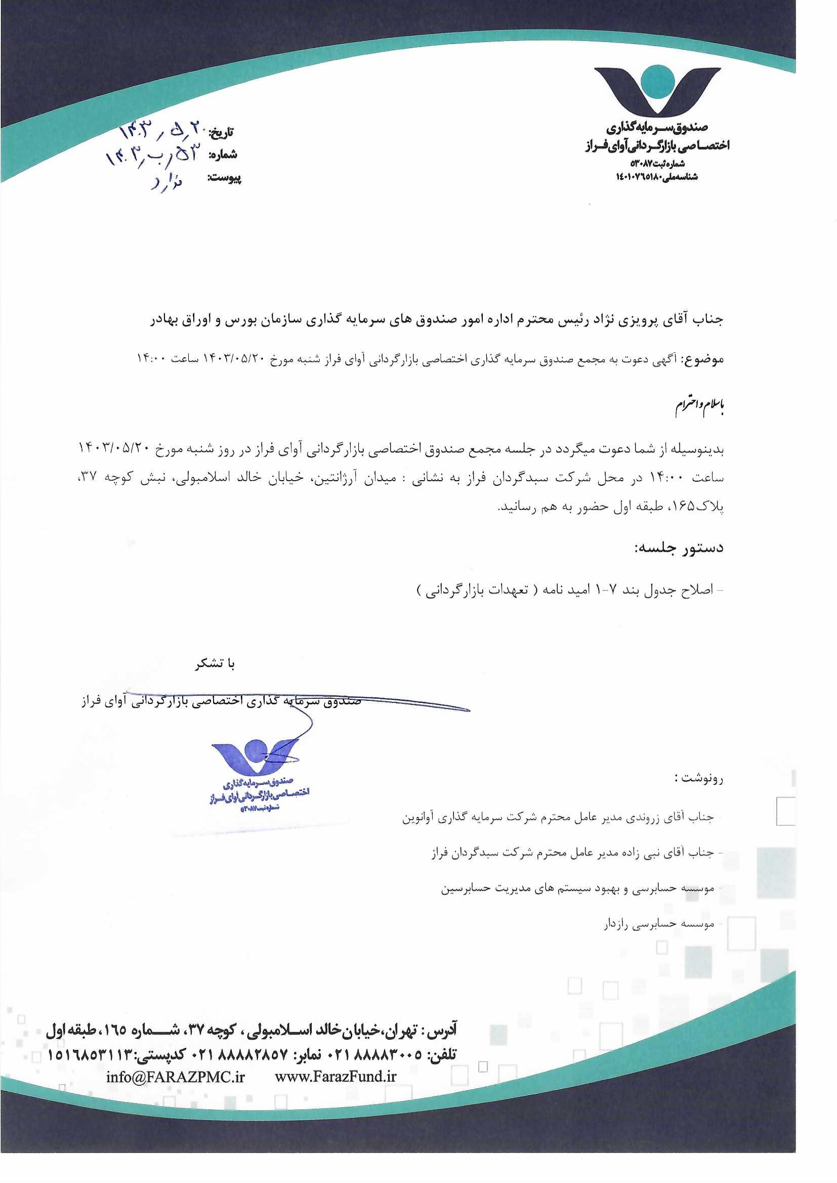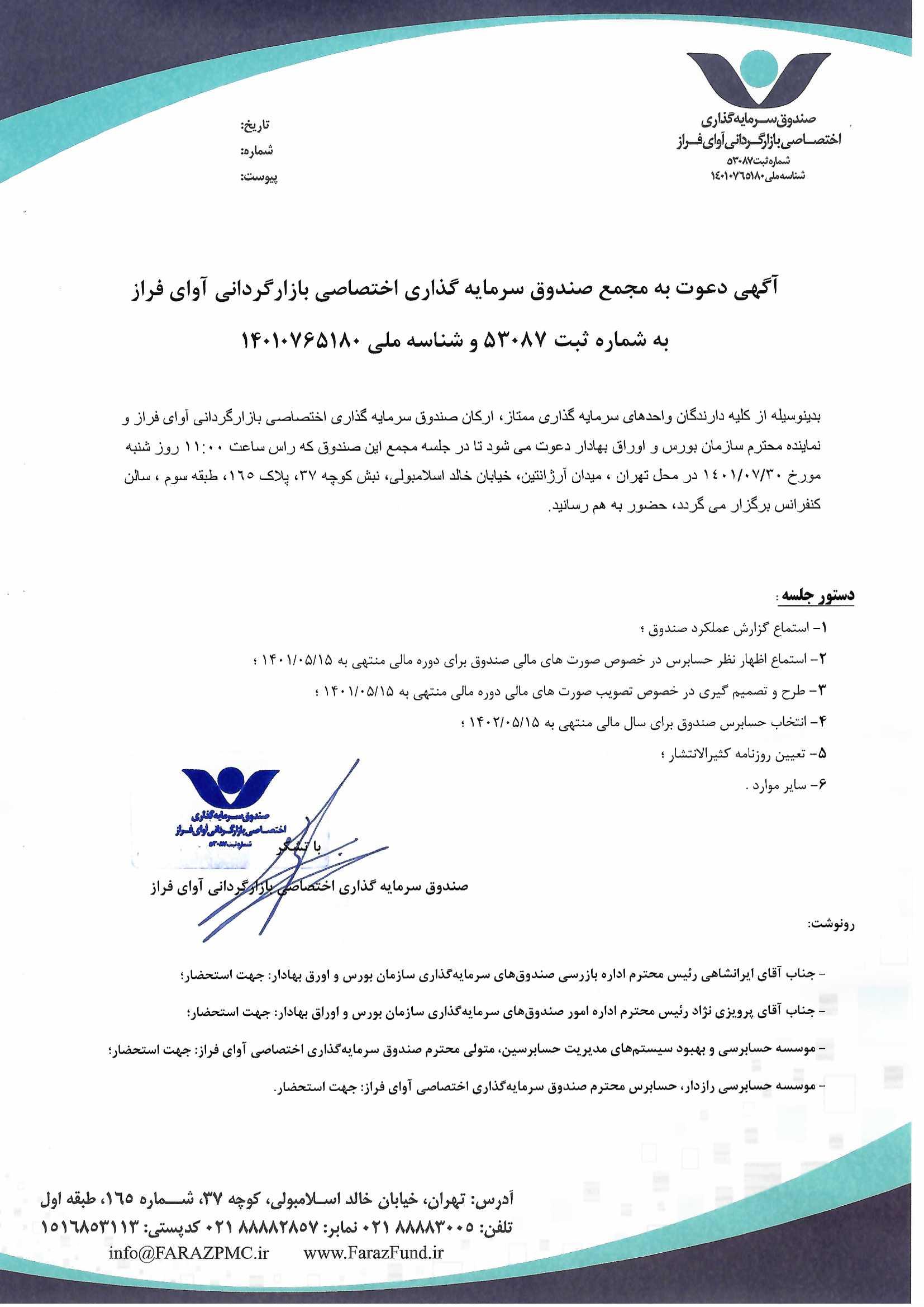 دعوت نامه به مجمع صندوق سرمایهگذاری اختصاصی بازارگردانی آوای فراز مورخ ۱۴۰۱/۰۶/۰۵ ساعت: ۱۰:۰۰