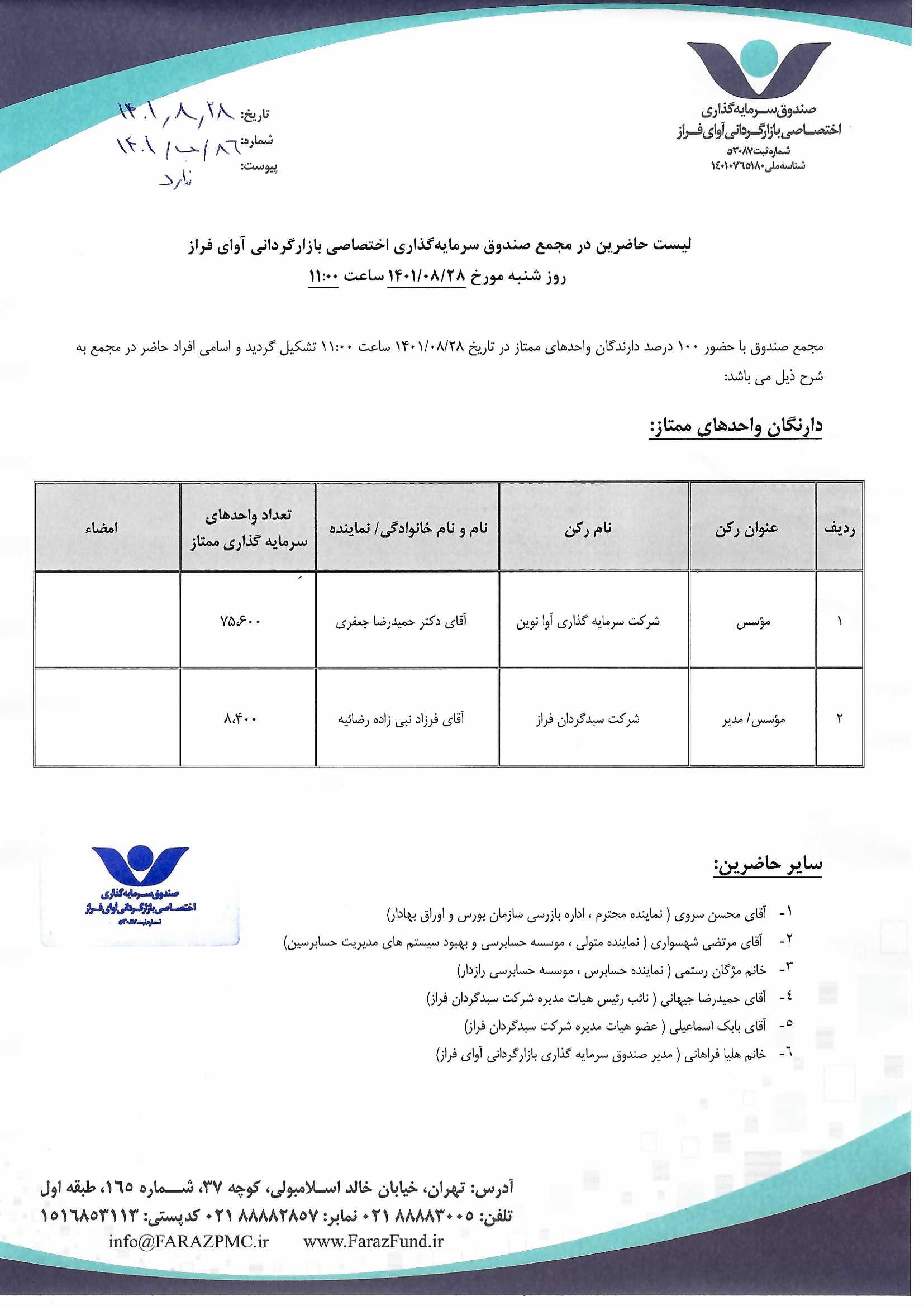 لیست حاضرین در مجمع صندوق سرمایه گذاری اختصاصی بازارگردانی آوای فراز مورخ ۱۴۰۱/۰۸/۲۸ ساعت ۱۱