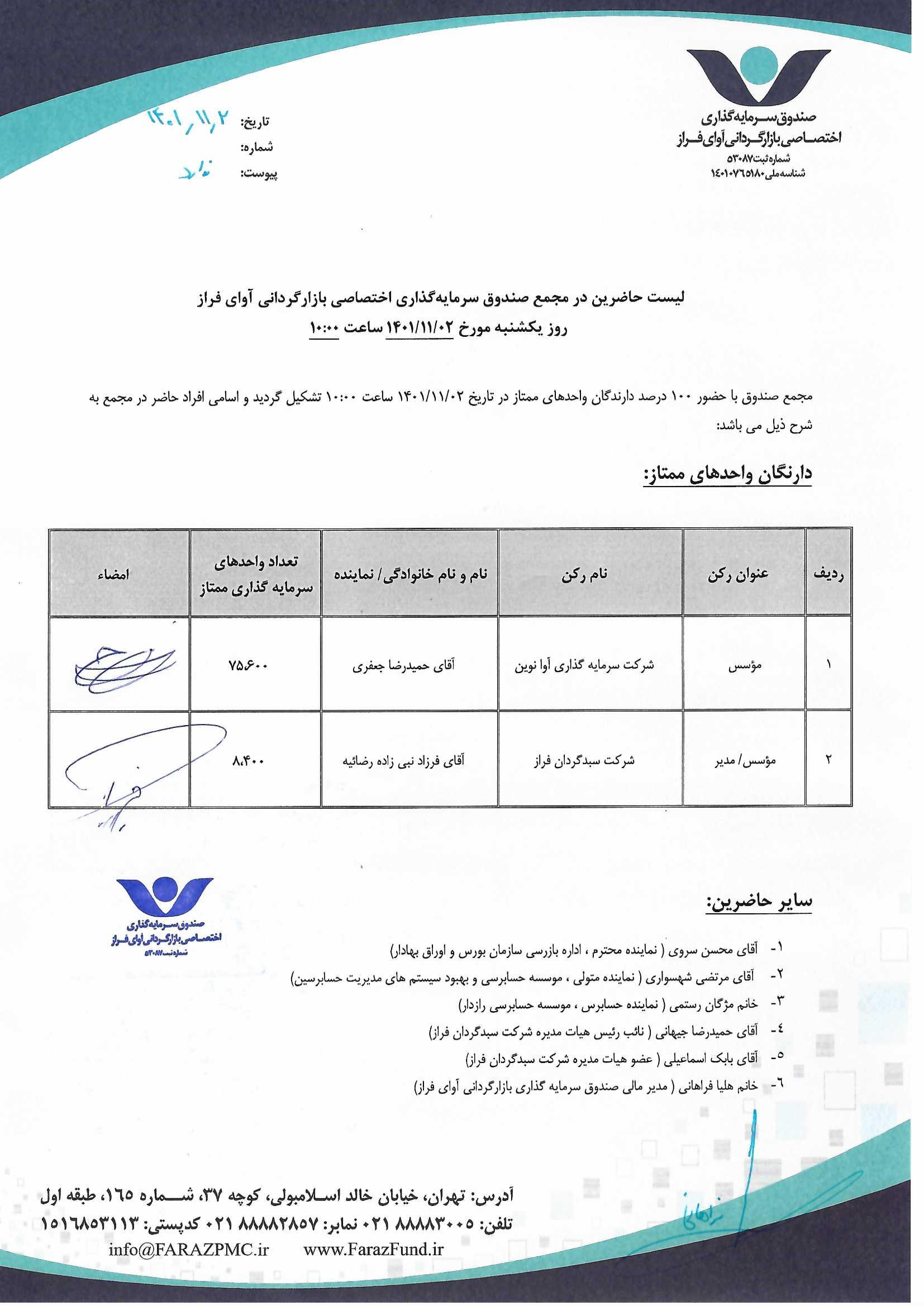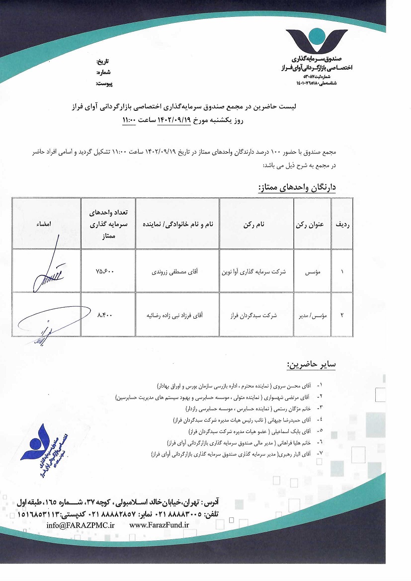 لیست حاضرین در مجمع صندوق سرمایه گذاری اختصاصی بازارگردانی آوای فراز مورخ ۱۴۰۱/۱۱/۰۲ ساعت ۱۰