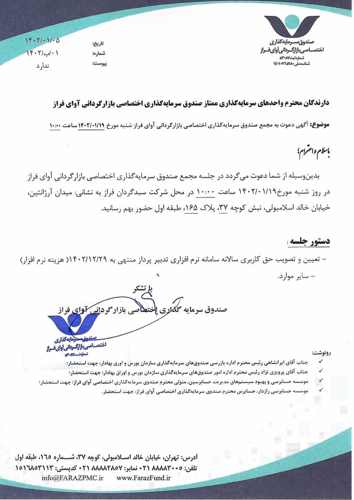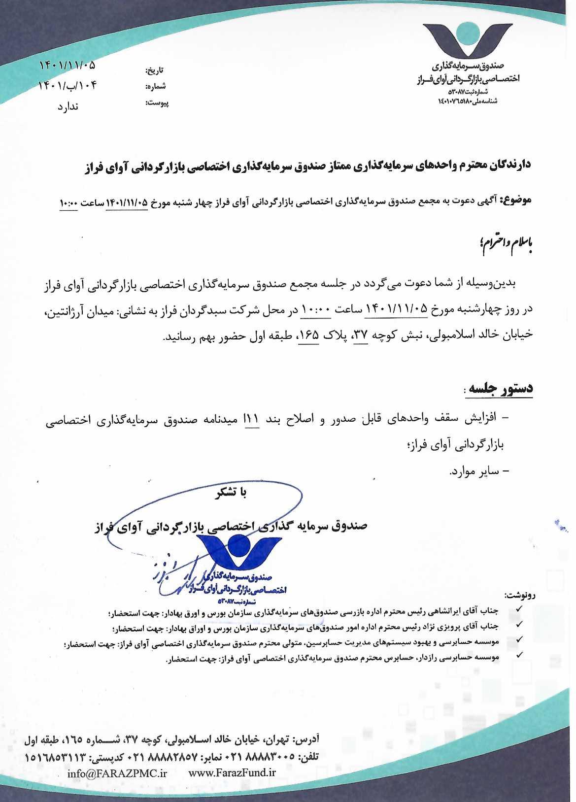 دعوتنامه مجمع صندوق سرمایه گذاری اختصاصی بازارگردانی آوای فراز مورخ ۱۴۰۱/۰۱/۱۵ ساعت ۸