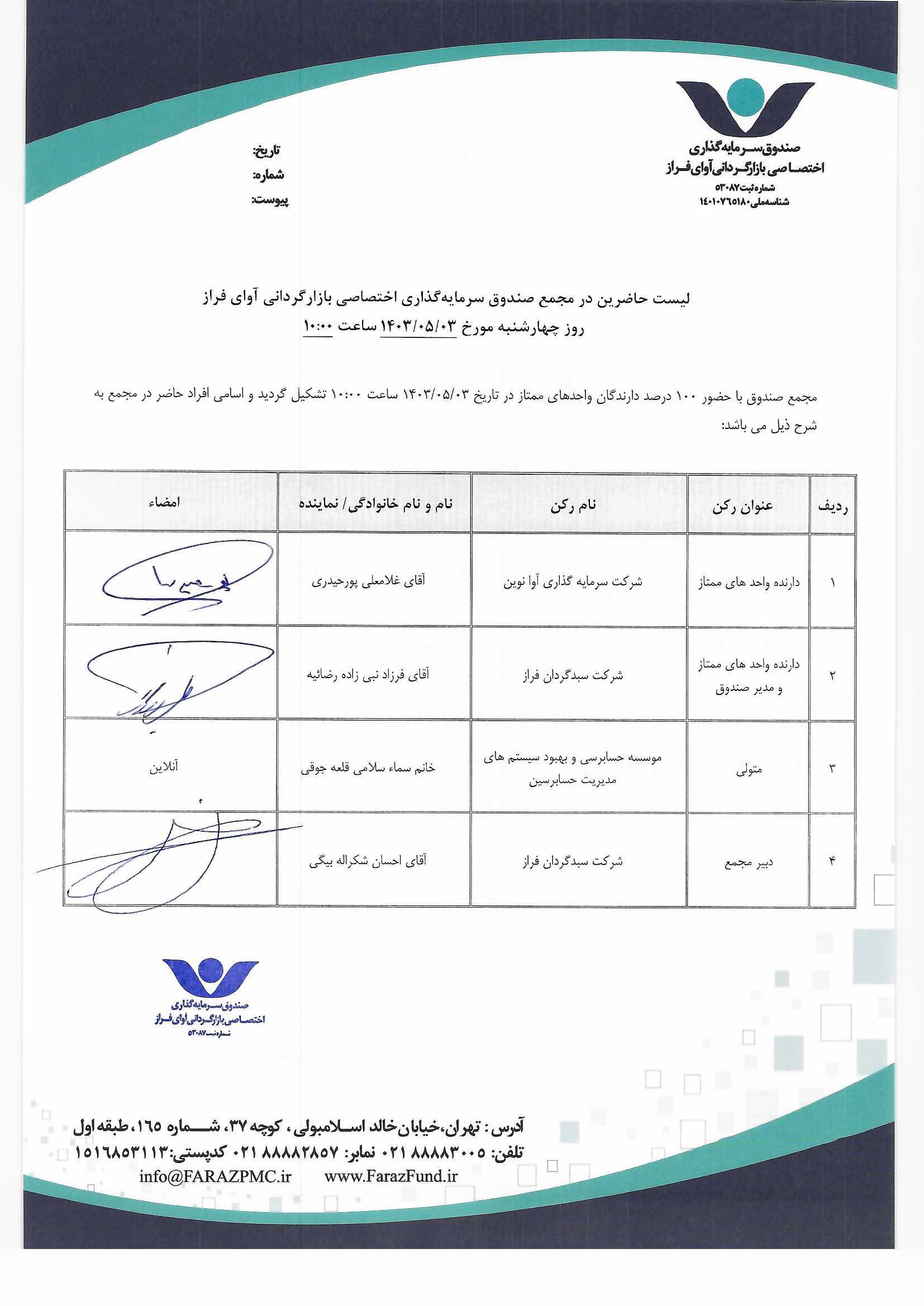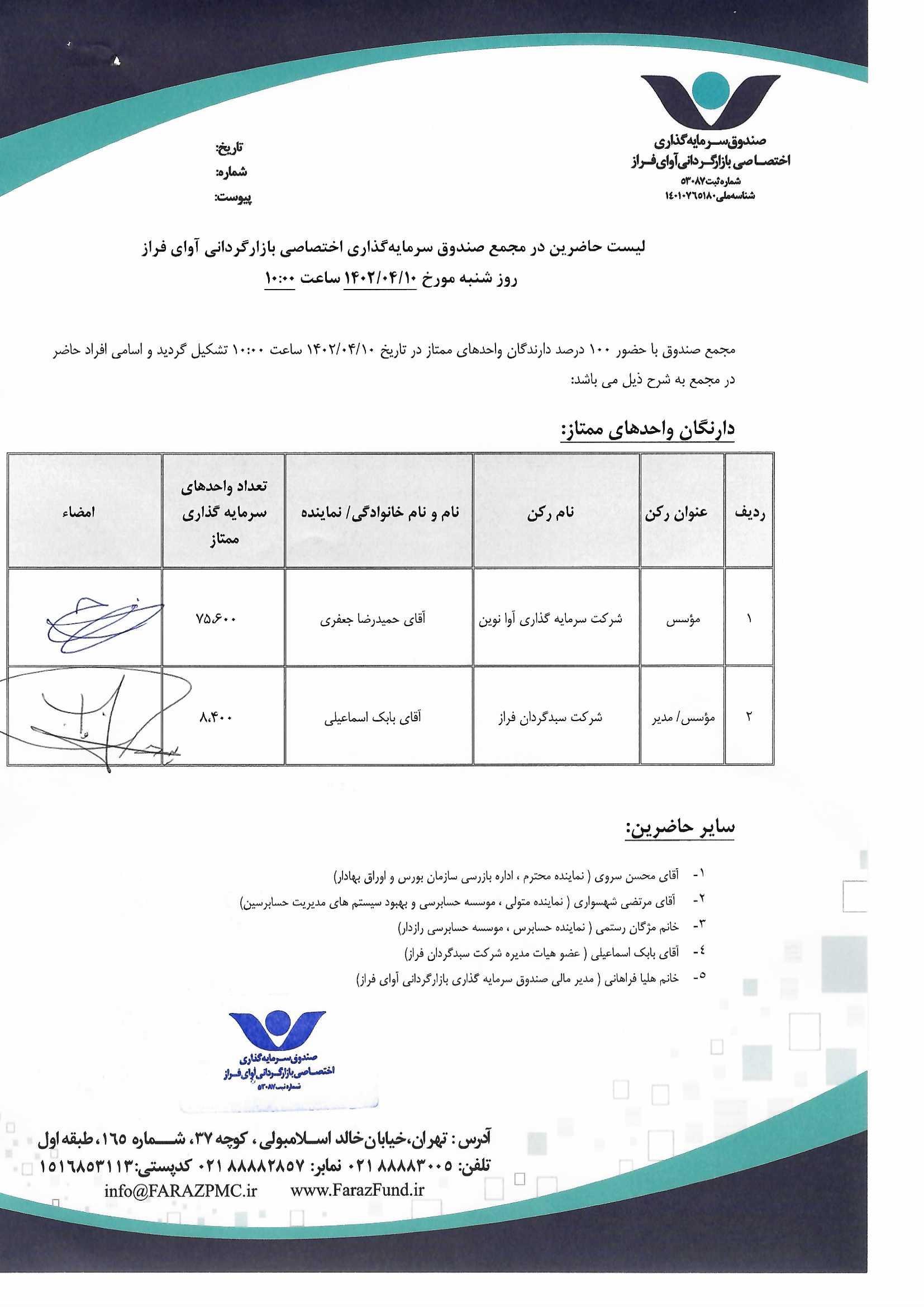 لیست حاضرین در مجمع صندوق سرمایه گذاری اختصاصی بازارگردانی آوای فراز مورخ ۱۴۰۱/۰۳/۰۴ ساعت ۱۰:۰۰