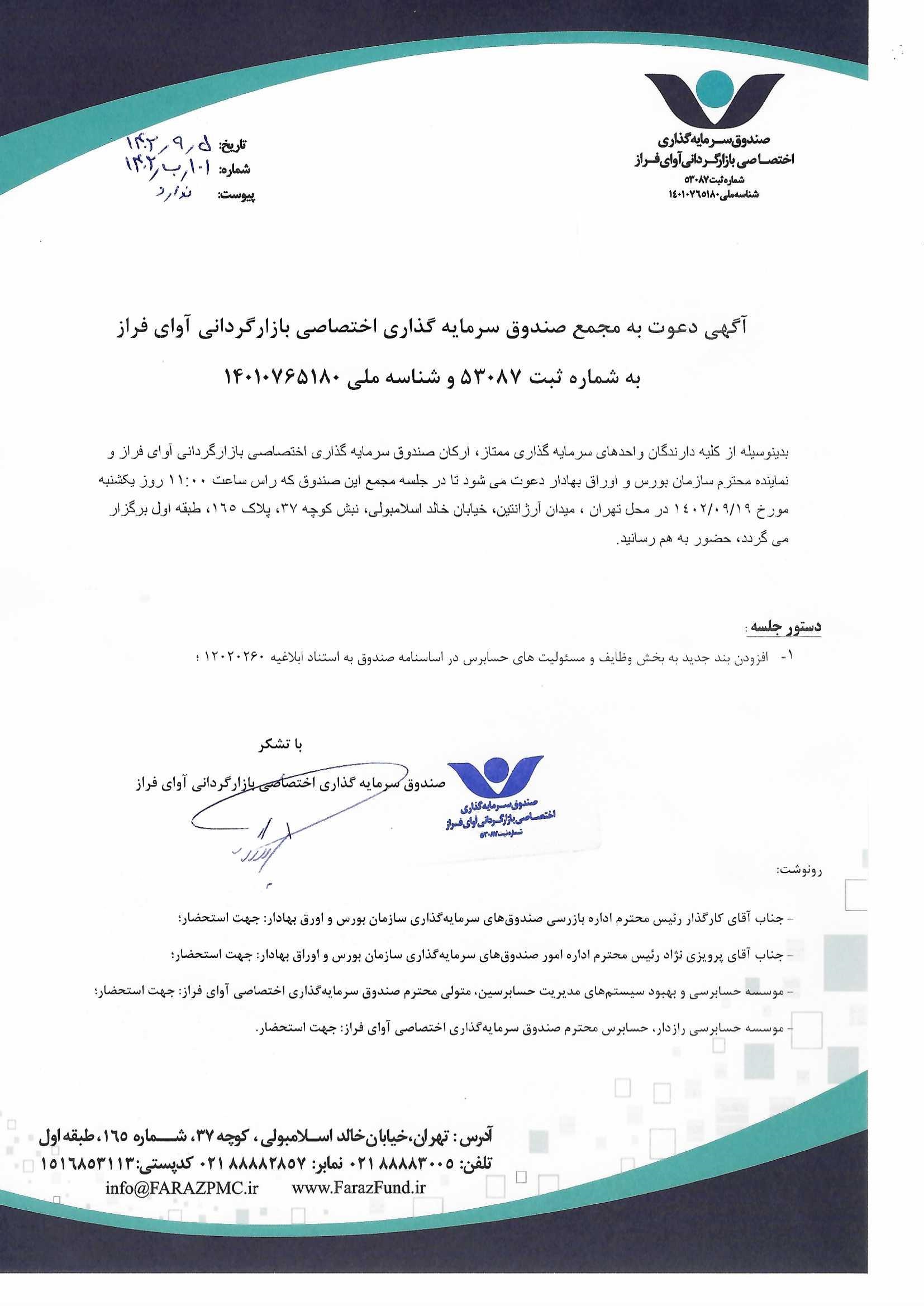 دعوت نامه به مجمع صندوق سرمایهگذاری اختصاصی بازارگردانی آوای فراز مورخ ۱۴۰۱/۰۵/۲۲ ساعت: ۱۰:۰۰