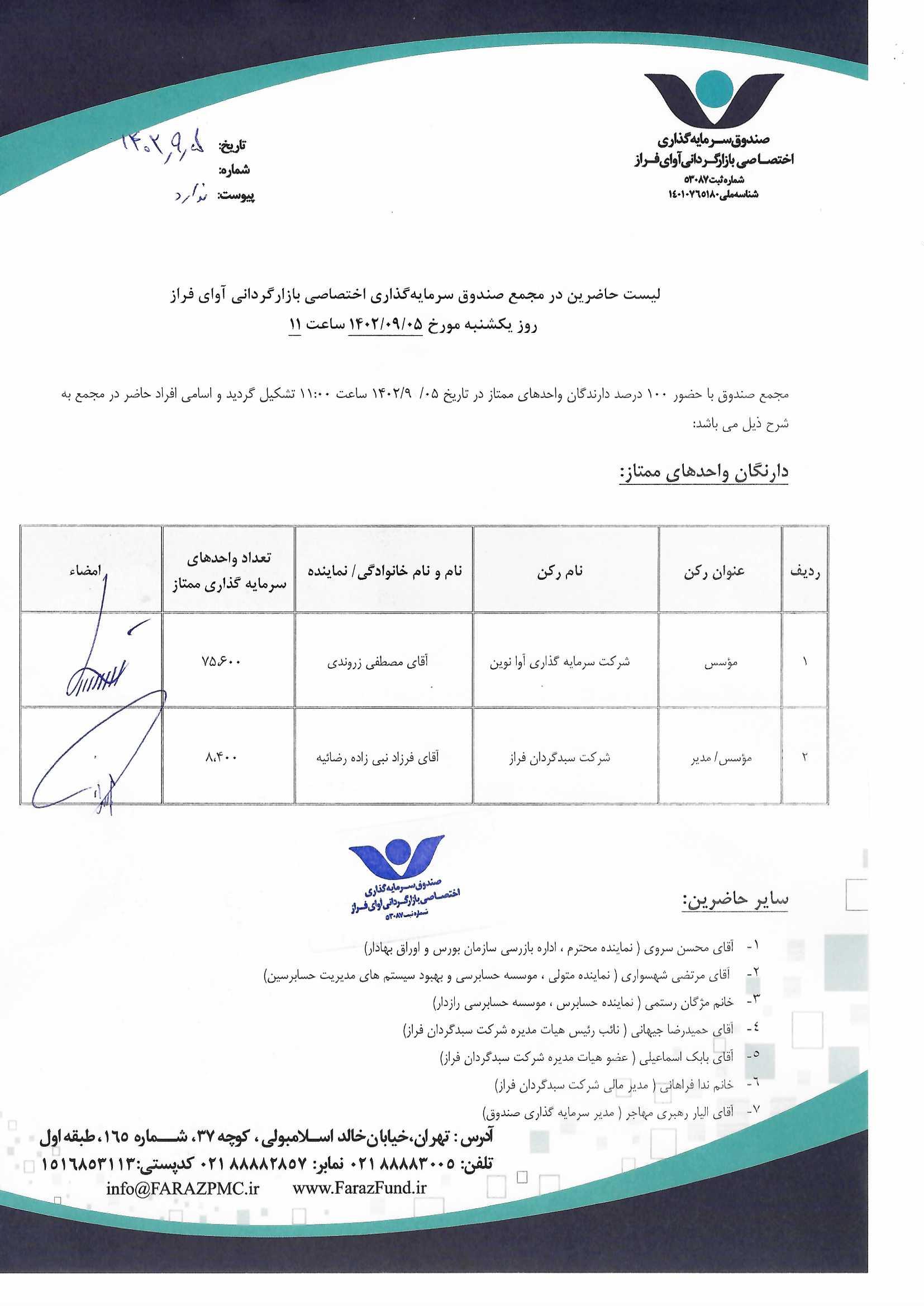 لیست حاضرین در مجمع صندوق سرمایه گذاری اختصاصی بازارگردانی آوای فراز مورخ ۱۴۰۱/۰۷/۳۰ ساعت۱۱