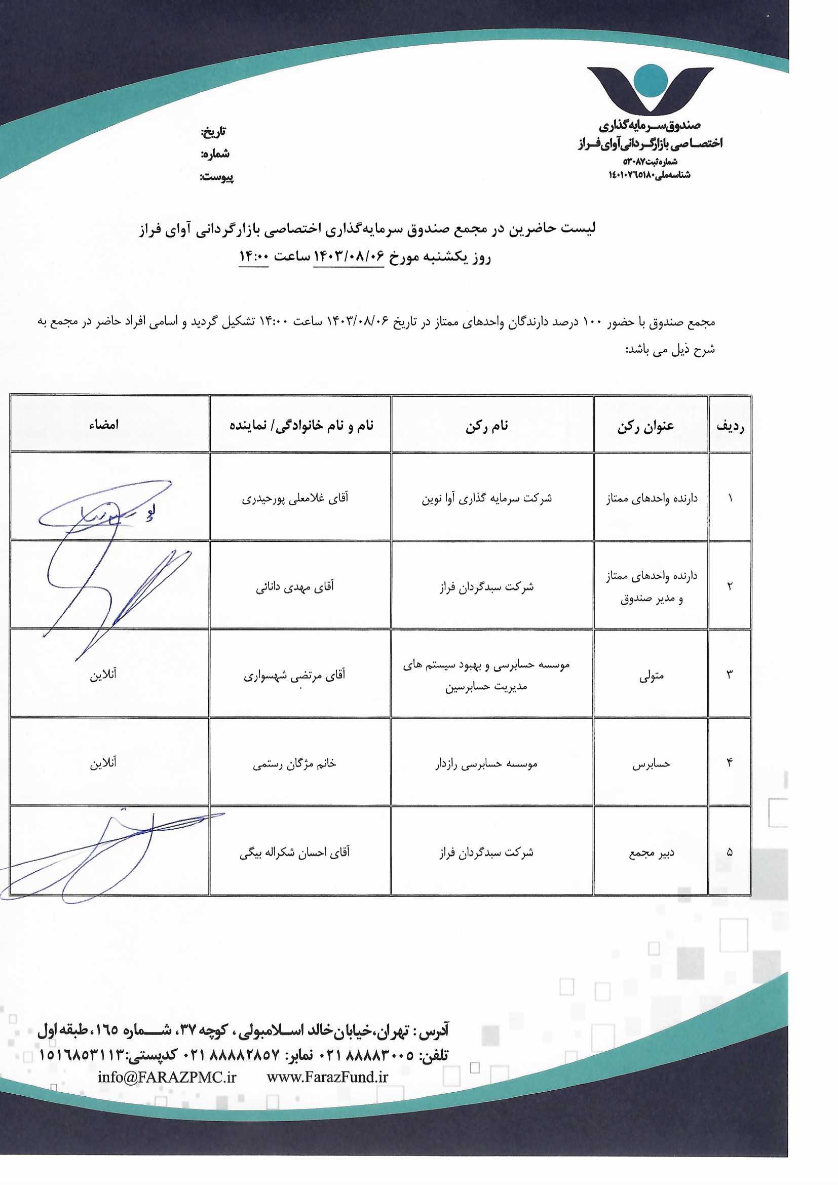 لیست حاضرین در مجمع صندوق سرمایه گذاری اختصاصی بازارگردانی آوای فراز مورخ ۱۴۰۳/۱۱/۱۳