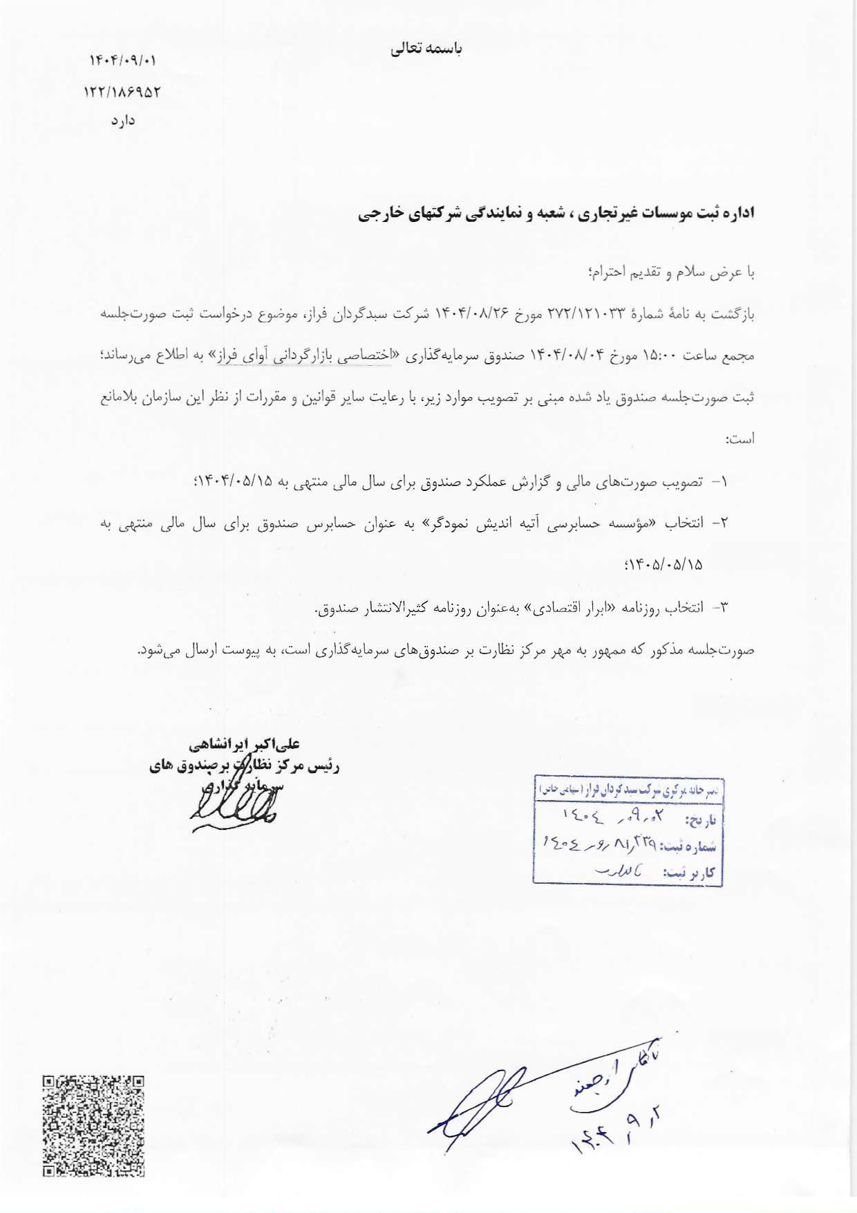 تاییدیه سازمان برای مجمع ساليانه صندوق مورخ ۱۴۰۴/۰۸/۰۴ ساعت ۱۵:۰۰( سال مالي منتهي به ۱۵ مرداد ۱۴۰۴)